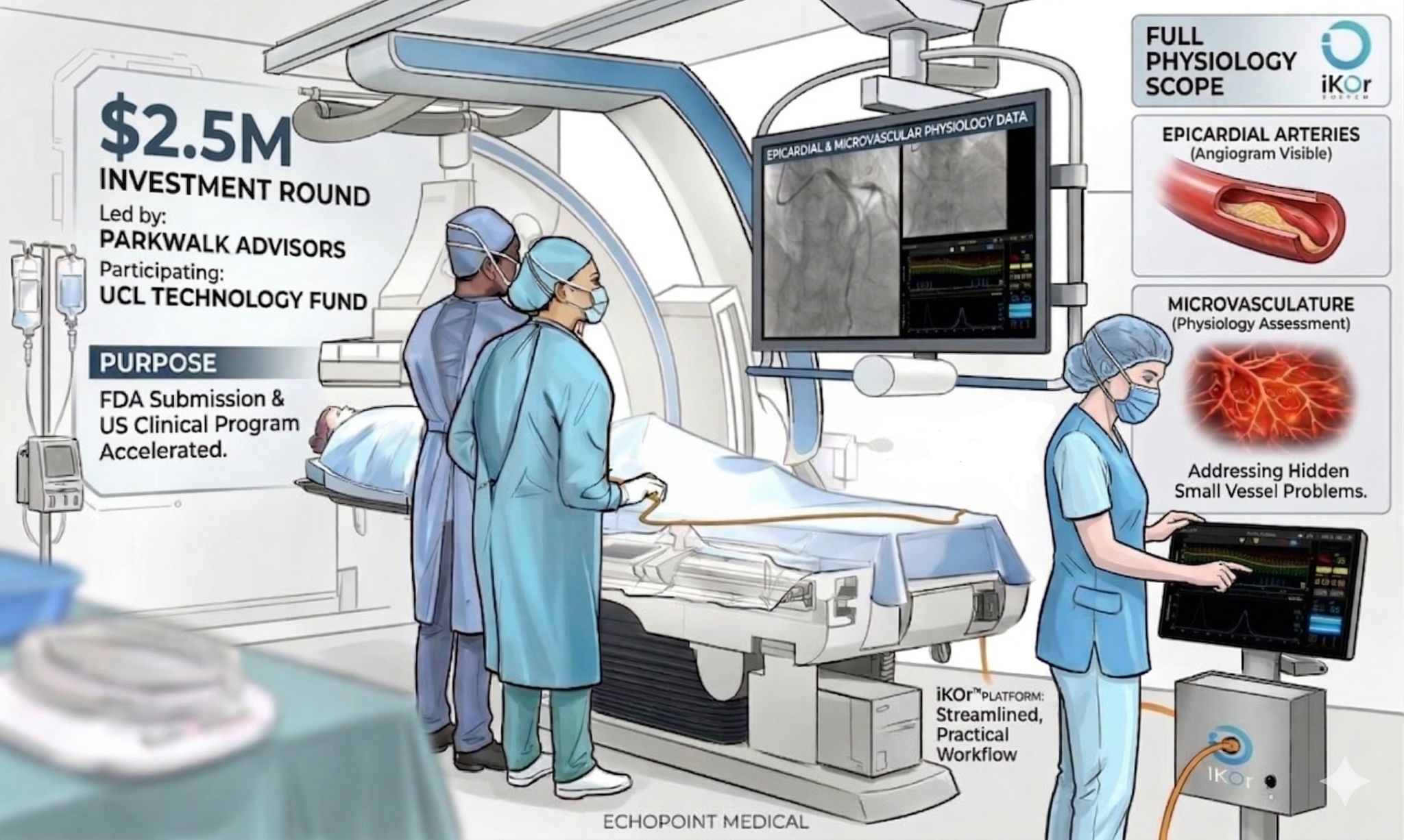 We are delighted to announce that EchoPoint Medical has secured a $2.5M investment round led by Parkwalk, with participation from UCL Technology Fund. This funding is a huge catalyst for us. We’re advancing directly toward our FDA submission and initiating our US clinical program to generate real-world evidence and show the iKOr system’s ability to measure coronary blood flow and pressure.